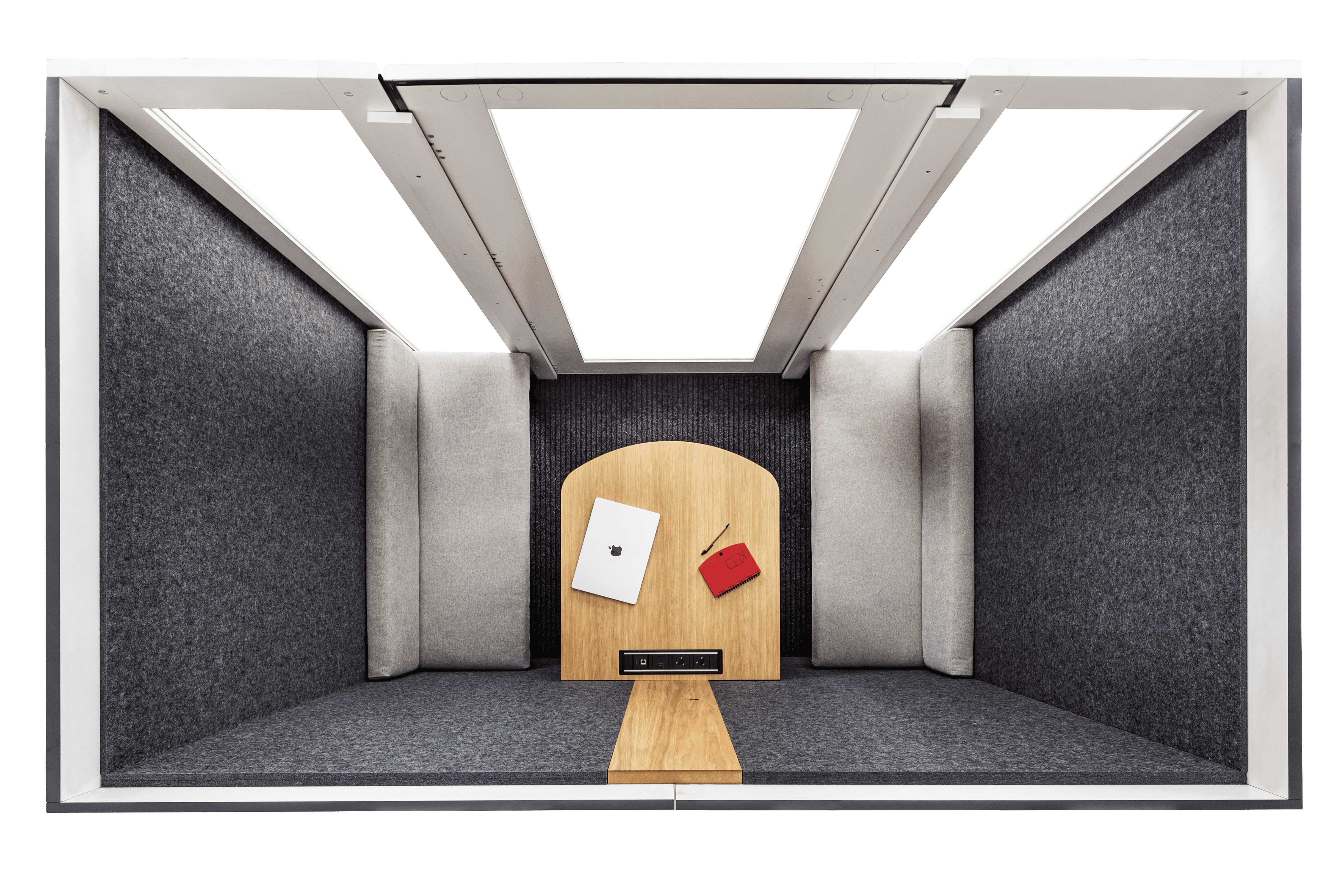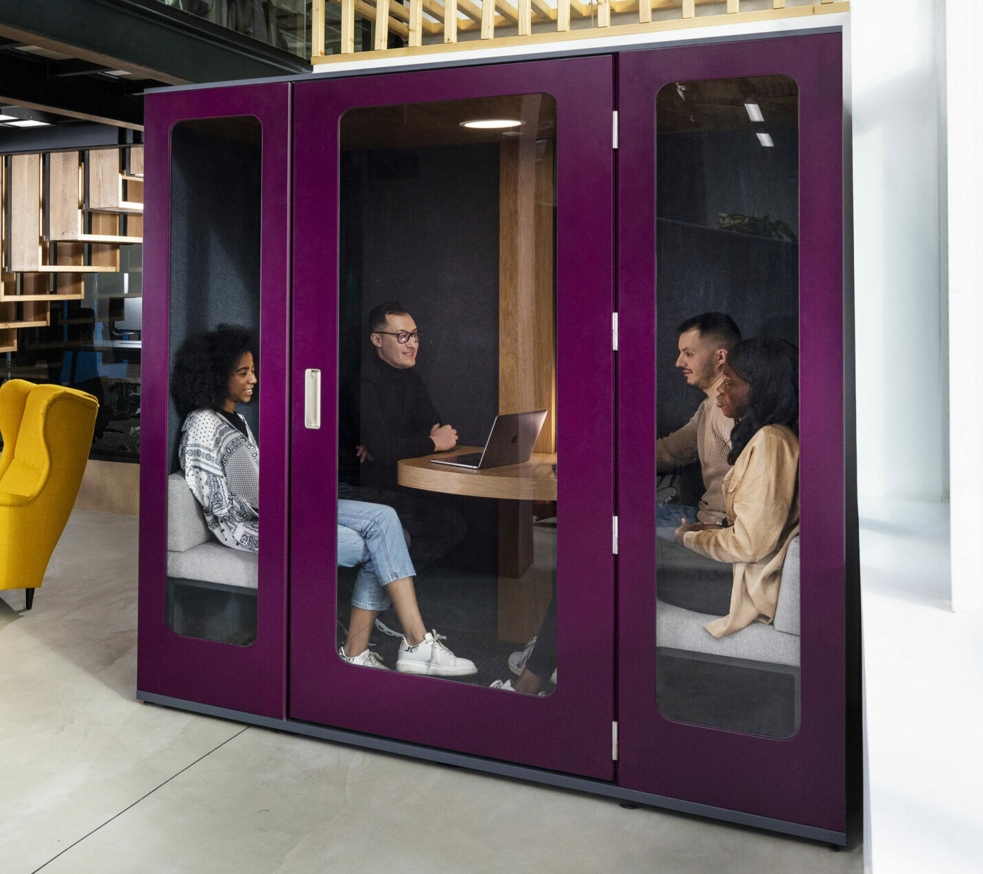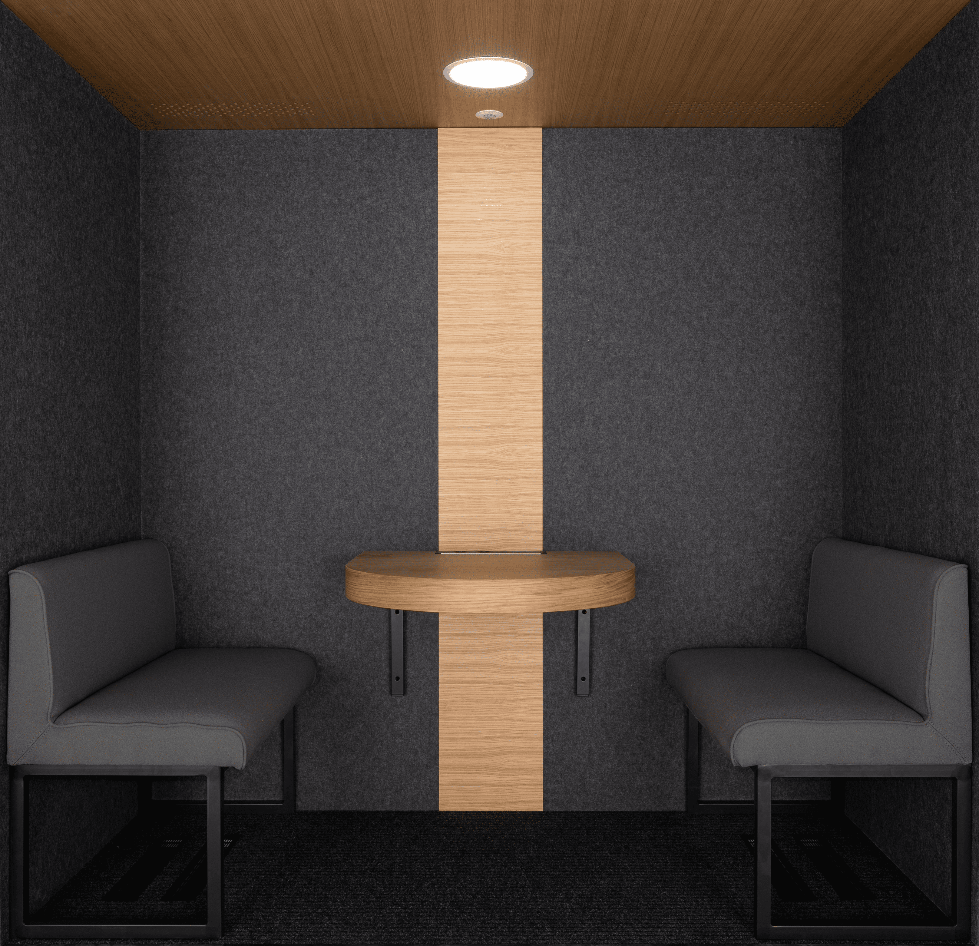 Avec ses deux grandes banquettes intégrées en tissu Camira, fournies sans frais supplémentaires et sa large table centrale, la EKO4 transforme chaque réunion en moment privilégié. Son espace généreux permet à quatre personnes de s’installer confortablement et de travailler en toute sérénité, sans se soucier du bruit extérieur ni du manque de concentration.
