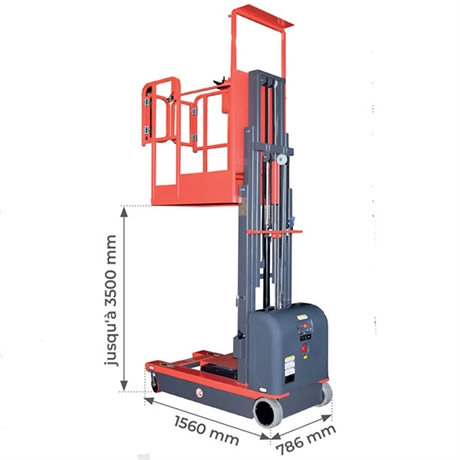 Cette nacelle est idéale pour les espaces restreints. Pour plus de sécurité, nous avons équipé notre nacelle d’un bouton d’arrêt d’urgence et d’un indicateur de charge Led.