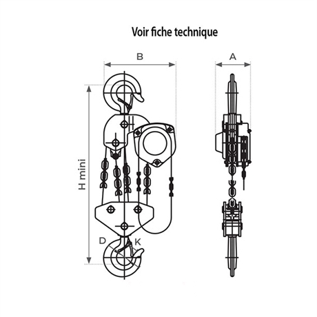 Cette gamme de palans à chaîne est disponible en 24 modèles différents, avec une capacité de charge allant de 500 kg à 10 tonnes, et avec diverses hauteurs allant de 3 à 12 mètres.