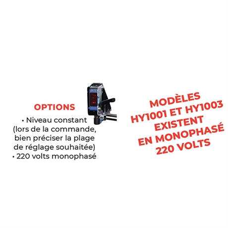 Elle est livrée avec une télécommande équipée d’un câble de 3 mètres pour une utilisation aisée à distance. Si nécessaire, elle peut être équipée en option d’un niveau constant, à préciser lors de la commande, ainsi que d’une alimentation de 220 volts monophasée.