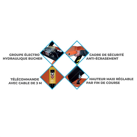 Elle est équipée d’un groupe électro-hydraulique de la marque Bucher, ainsi que d’un cadre de sécurité pour stopper la descente en cas d’obstacle. Ses galets et bagues sont auto-lubrifiés pour une meilleure durabilité. Le bloc moteur et les commandes disposent d’un blocage de la descente en cas de rupture du flexible hydraulique.