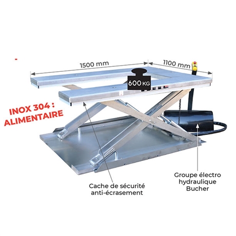 Fabriquée en acier inoxydable 304 de qualité alimentaire, cette table ciseau électrique est hygiénique et résistante à la corrosion. Le plateau en U de 1500 x 1100 mm est parfait pour déposer les palettes directement sur la table en toute sécurité. La base de la table mesure 1440 x 1058 mm, ce qui permet de la positionner facilement dans différents espaces de travail.