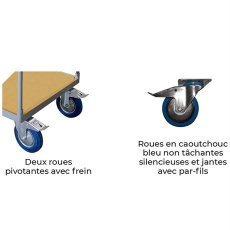 Afin de s’adapter au mieux à toutes les activités, vous avez la possibilité de choisir entre deux dimensions de plateaux : 1050 x 700 et 1250 x 800 mm. Ce chariot de manutention à plateau bois est équipé de roues en caoutchouc silencieuses qui permettent de ne pas déranger les collaborateurs aux alentours. Afin d’être plus stable et plus maniable, il possède deux roues fixes et deux roues pivotantes. Il deviendra rapidement votre indispensable au quotidien. Résistant et pratique, il vous permettra d’effectuer toutes vos tâches et d’être plus performant.