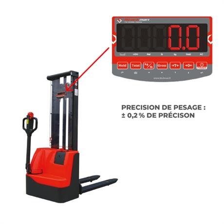 Ce gerbeur électrique peseur possède un système de pesage de haute qualité. Avec une précision à ± 0,2 %, il offre à la fois tous les avantages du gerbeur électrique et les avantages d’un transpalette peseur. Très précis, il vous permettra de connaître le poids de vos charges mais également de bénéficier de certaines fonctions telle que la totalisation. Celle-ci permet d’additionner plusieurs charges et d’avoir connaissance du total pour les expéditions ou les commandes reçues. Elle permet également de vérifier que la charge n’a pas été pesée deux fois ou oubliée et limite ainsi les erreurs. La graduation se fait par des échelons de 500 grammes.