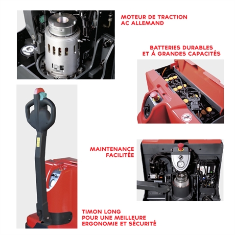 Robuste, il est durable dans le temps et sera un très bon investissement. Les pièces de ce transpalette ont été soigneusement choisies parmi des marques reconnues du secteur de la manutention : Kordel, Intorq, Wicke etc.. Le groupe moteur AC conçu en Allemagne est puissant et ne nécessite pas d’entretien. Ce transpalette électrique 1600 kg permet de gagner en productivité car il monte à une vitesse allant jusqu’à 6km/h.Très maniable, il est facile d’utilisation pour l’opérateur. Il permet également de lutter contre les troubles musculo-squelettiques (TMS).