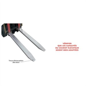 • Extensions de fourches : Elles permettent d’augmenter la capacité de levage et de transporter des charges plus longues en toute sécurité.